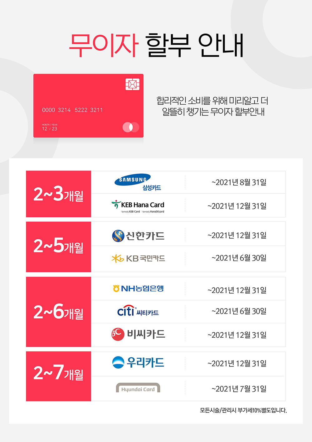 2021년 카드사별 무이자할부 안내