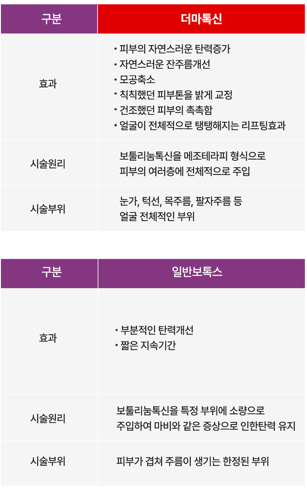 피부를 뜻하는 '더마'와 보툴리눔톡신의 '톡신'이 조합된 합성어로 흔히 스킨보톡스라 불리우며 기존의 보톡스 시술과는 달리 근육을 거의 마비시키지않고 진피층이나 근막에 작용하기 때문에 주름이 자연스럽게 좋아지게 되고 리프팅 효과 또한 볼 수 있습니다.