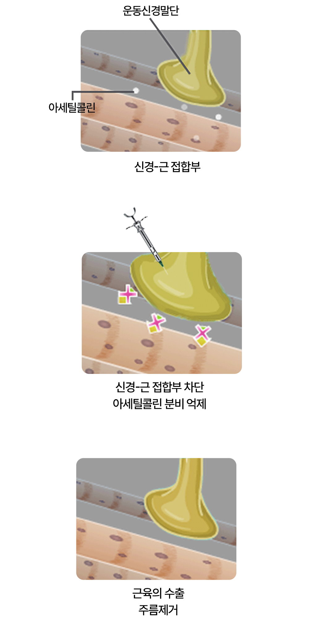 보툴리늄 독소가 운동신경 말단의 수용체 부위에 결합해 아세틸콜린의 유리를 억제시켜줌으로써 신경과 근전도를 차단, 근육마비를 일으키며 근육의 수축을 가져와 주름제거 및 사각턱 근육축소 등에 효과.