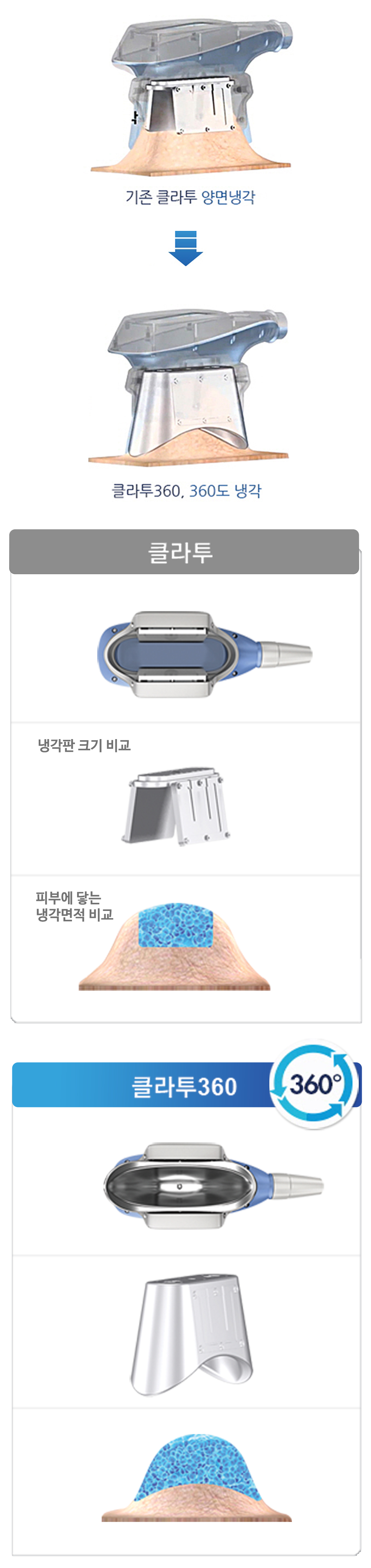 클라투360은 360도 전면은 사용하는 냉각지방분해방식입니다. 2배 더 넓어진 냉각판은 넓은 부위 시술이 가능하고 피부에 닿는 cup이 유선형으로 제작되어 시술이 편해졌습니다.