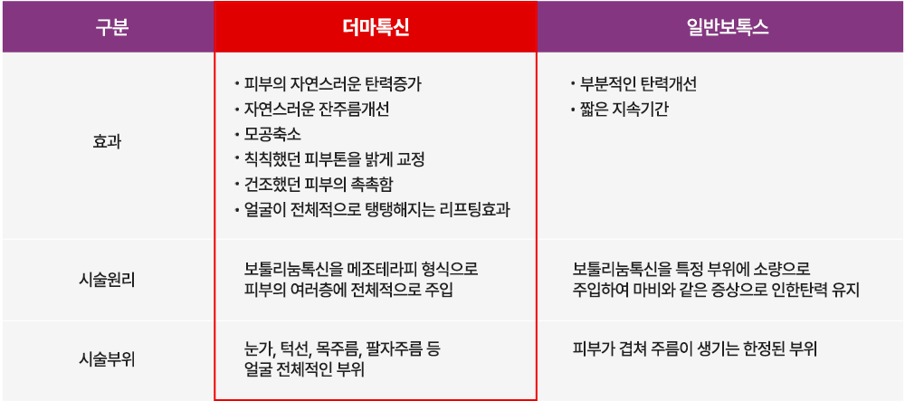 기존의 보톡스 시술과는 달리 근육을 거의 마비시키지않고 진피층이나 근막에 작용하기 때문에