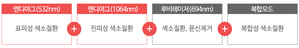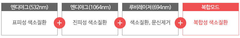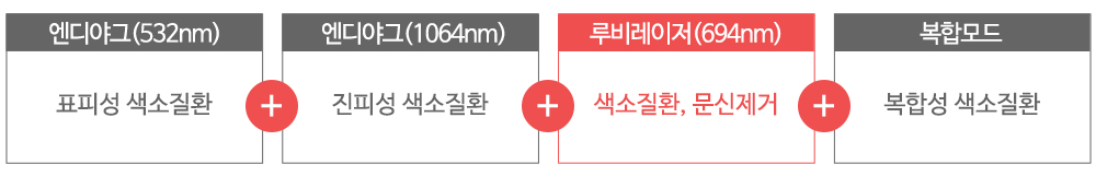 (532nm, 1064nm)과 루비레이저(694nm)를 복합적으로 사용하여 치료를 진행할 수 있습니다.