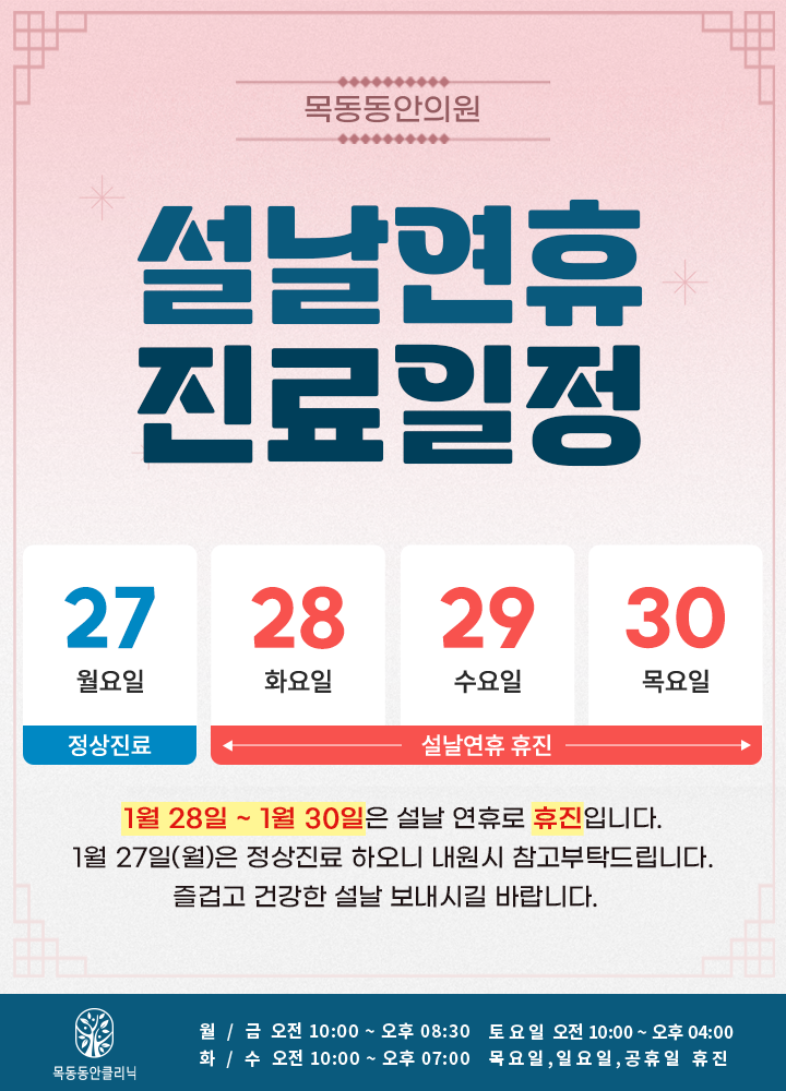 설날연휴 2025.01.28(화) ~ 01.30(목) : 휴진