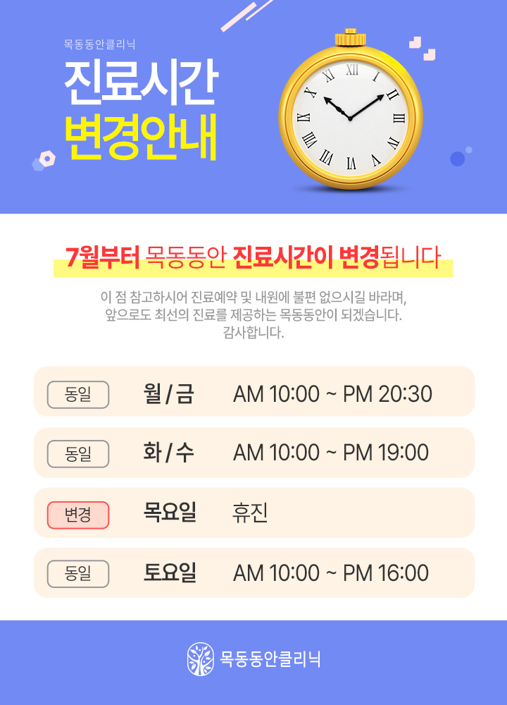 | 2024년 7월부터 진료시간이 변경됩니다. |