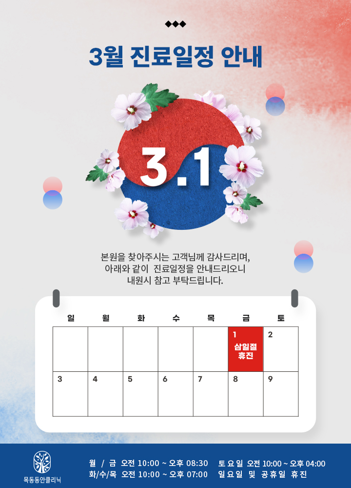 아래와 같이 3월 진료일정을 안내드리오니 내원시