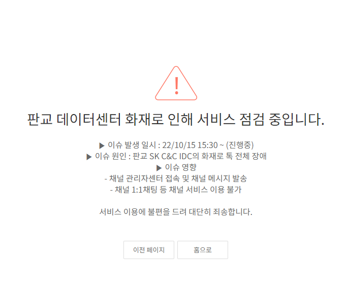 2022년 10월 15일(토) 카카오톡 판교 데이타센터 화재로 인하여